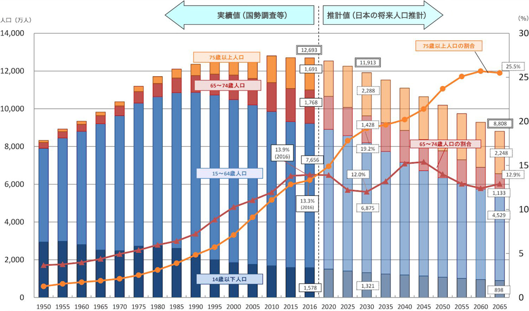 資料:2016年までは総務省統計局「国勢調査」および「人口推計」、2020年以降は国立社会保障・人口問題研究所「日本の将来推計人口(平成29年4月推計)中位推計」